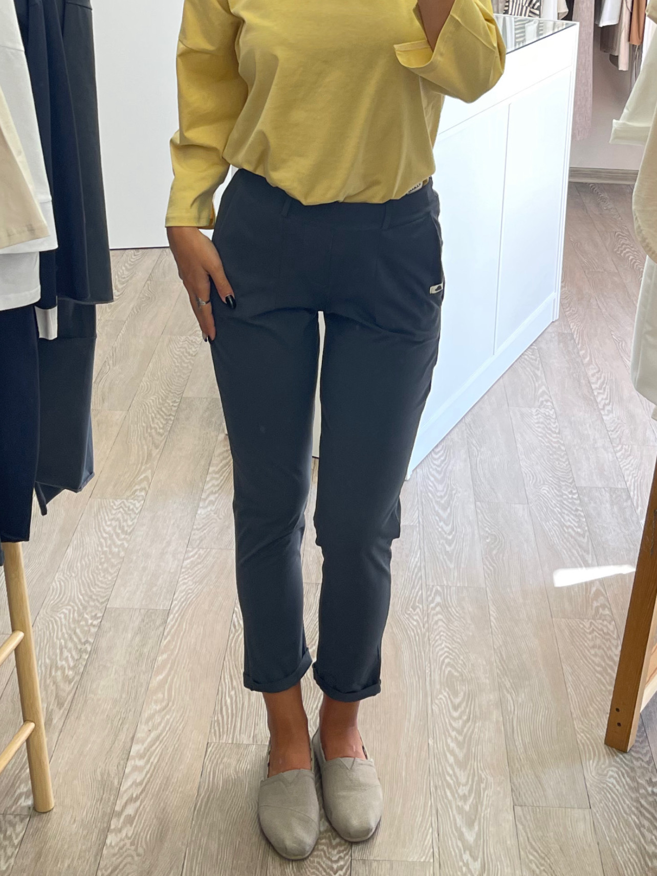 Παντελόνι με λάστιχο στη μέση,τσέπες στα πλαϊνά,ρεβέρ στο τελείωμα.Έχει μεγάλη ελαστικότητα,στενή γραμμή