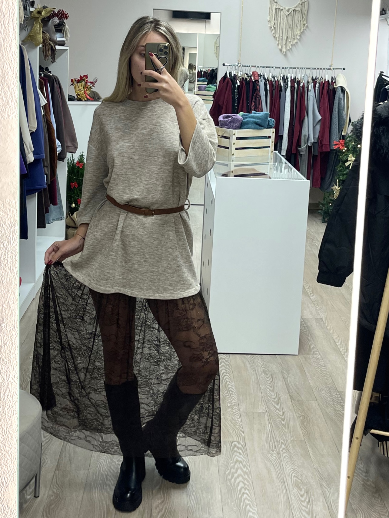 Φόρεμα πλεκτό με δαντέλα στο τελείωμα. Θυλάκια με ζώνη στη μέση